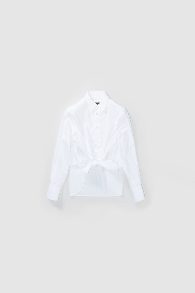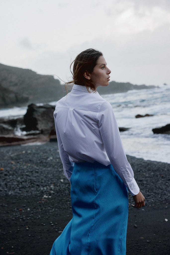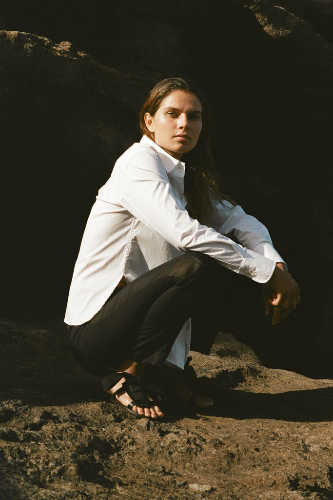 Our BUTTON UP BLOUSE is made out of cotton stretch poplin. The shirt features a classic button stand and perfect fit. A fancy hemline lets you wear the blouse tucked in as well as over your bottoms. For a summer look you can also knot it in the front.