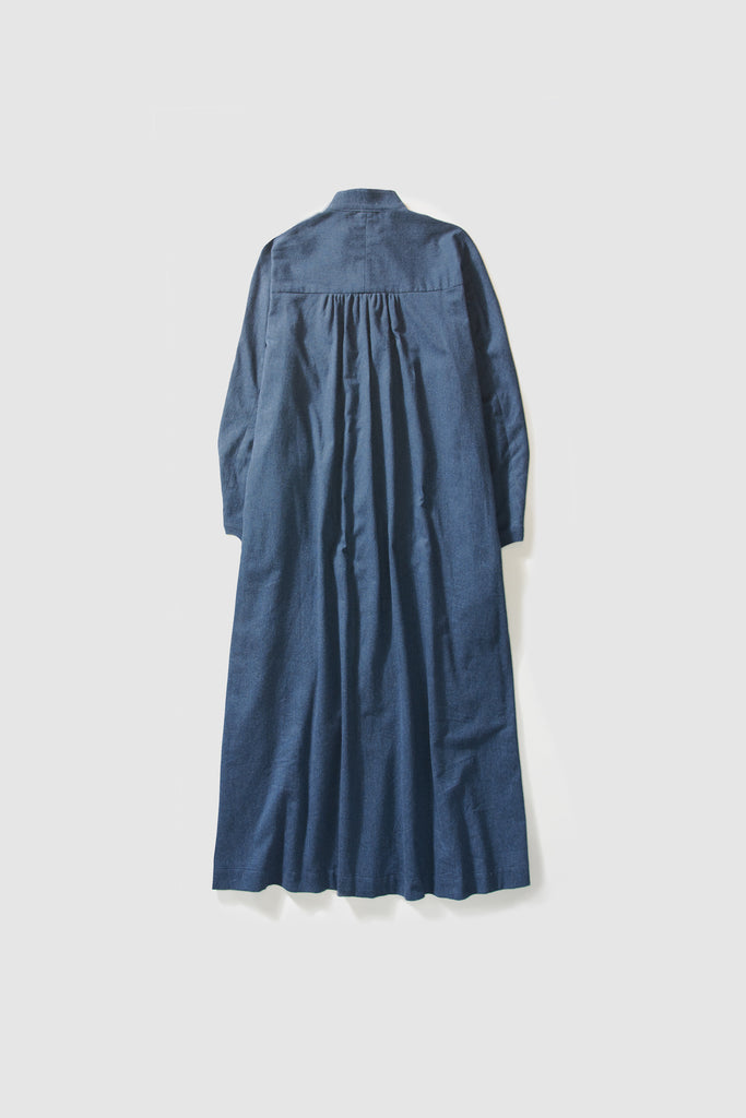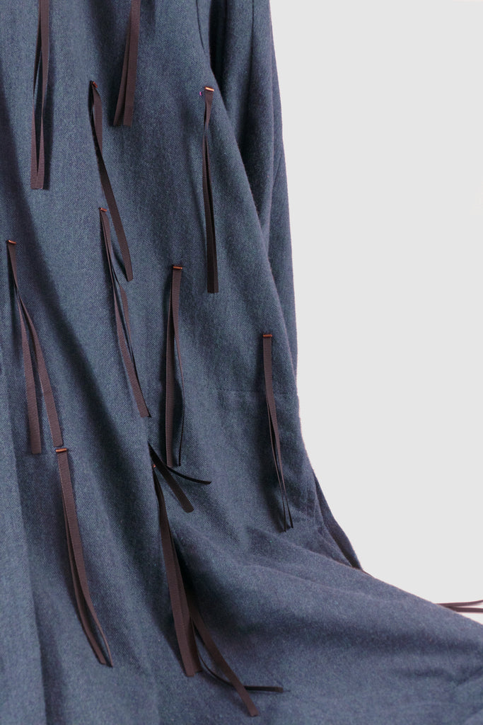 A-line maxi dress with draped full length sleeves, in ultrasoft Italian cotton flannel. Features fringes and brass pearl stitching at the front. Deep side pockets.