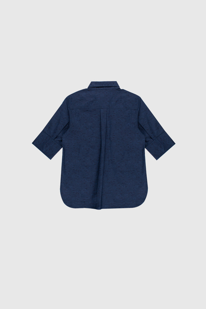 Our WHITNEY BLOUSE NAVY is reimagined in our signature cotton stretch poplin, now featuring a subtle celestial print of moons and suns woven into the fabric. This unique take on a classic design showcases a sculptural hemline and soft structure, offering a fresh, modern edge. A timeless silhouette elevated with a cosmic twist.